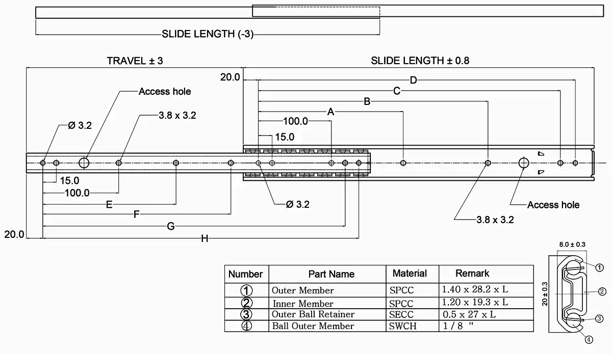 | Part Number | Slide Length (mm) | Travel (mm) | Mounting Hole (mm) ± 0.3 mm | Load Capacity (N/pair) | Product Weight (kg/piece) | Quantity in Package (pieces) | |||||||
