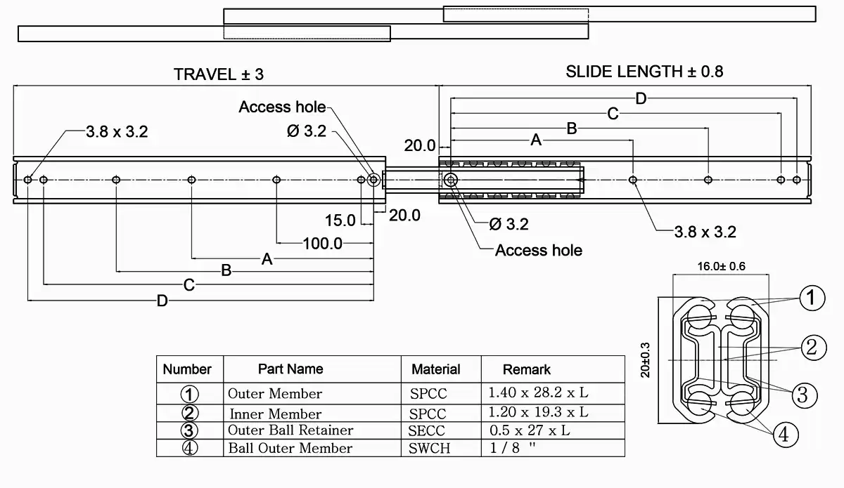 | Part Number | Slide Length (mm) | Travel (mm) | Mounting Hole (mm) ± 0.3 mm | Load Capacity (N/pair) | Product Weight (kg/piece) | Quantity in Package (pieces) | |||
