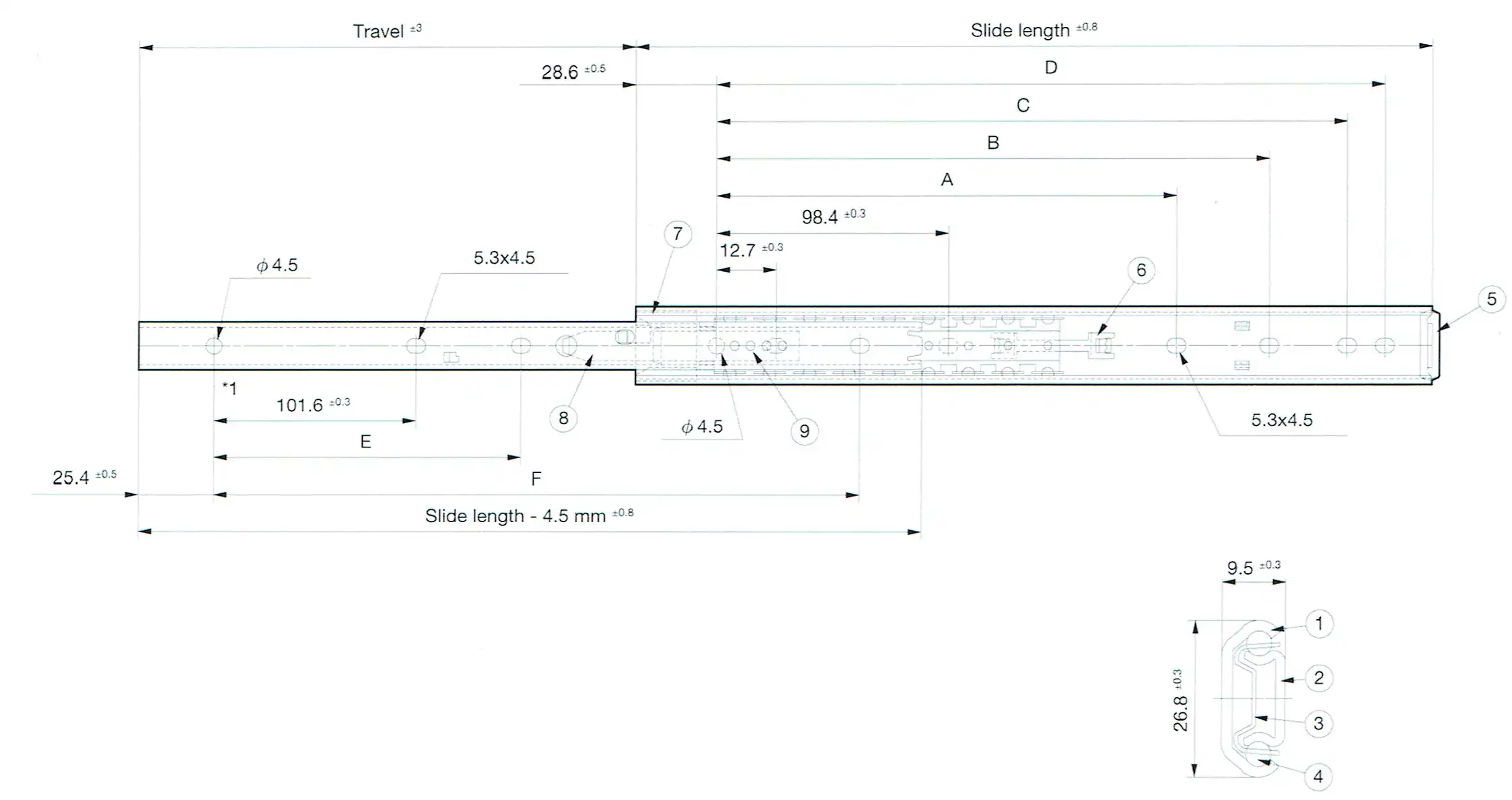 | Part Number | Slide Length (mm) | Travel (mm) | Mounting Hole (mm) ± 0.3 mm | Load Capacity (N/pair) | Product Weight (kg/piece) | Quantity in Package (pieces) | |||||