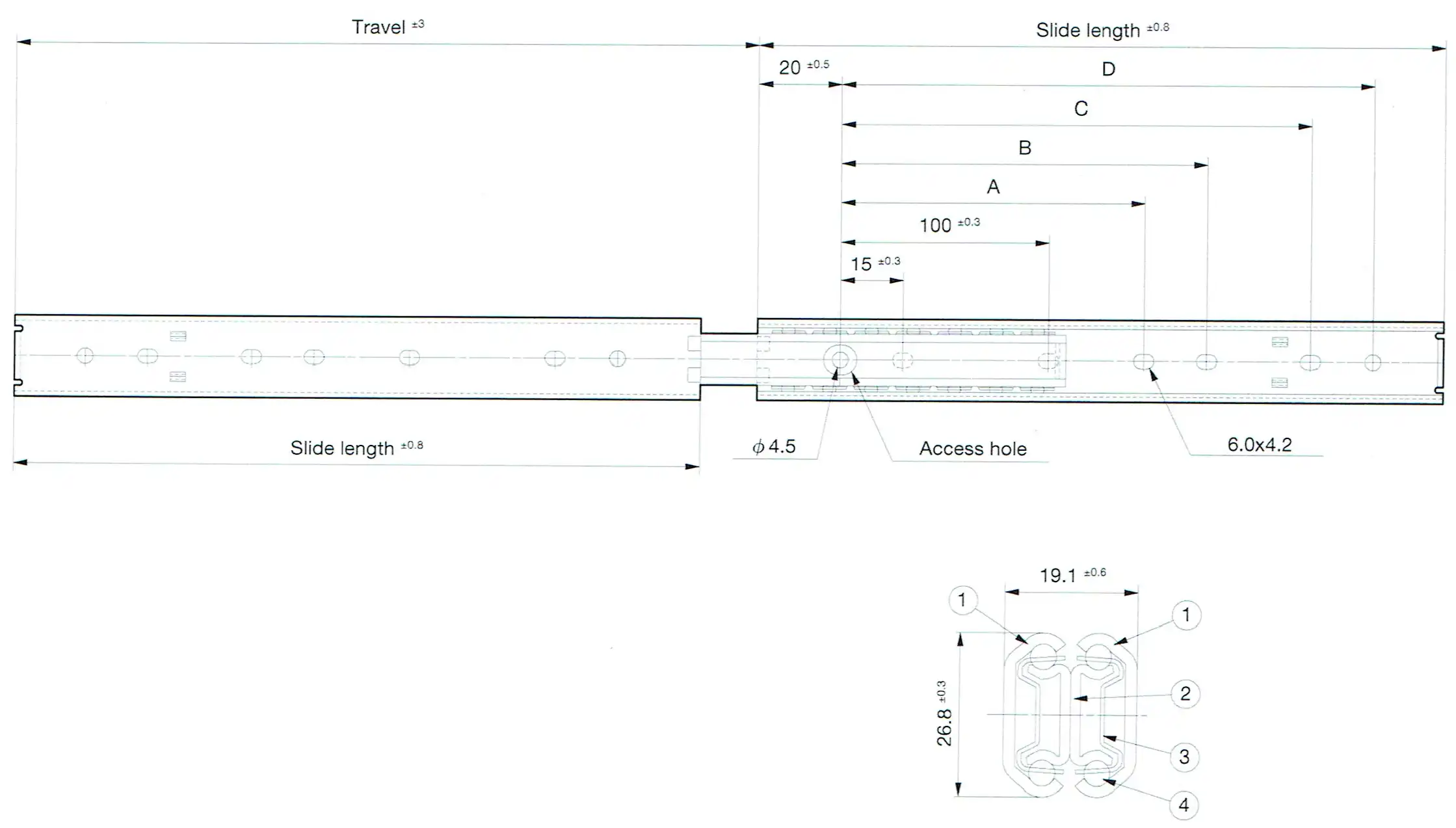 | Part Number | Slide Length (mm) | Travel (mm) | Mounting Hole (mm) ± 0.3 mm | Load Capacity (N/pair) | Product Weight (kg/piece) | Quantity in Package (pieces) | |||