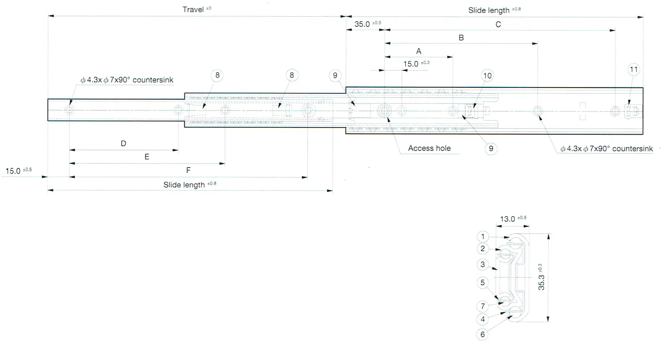 | Part Number | Slide Length (mm) | Travel (mm) | Mounting Hole (mm) ± 0.3 mm | Load Capacity (N/pair) | Product Weight (kg/piece) | Quantity in Package (pieces) | |||||