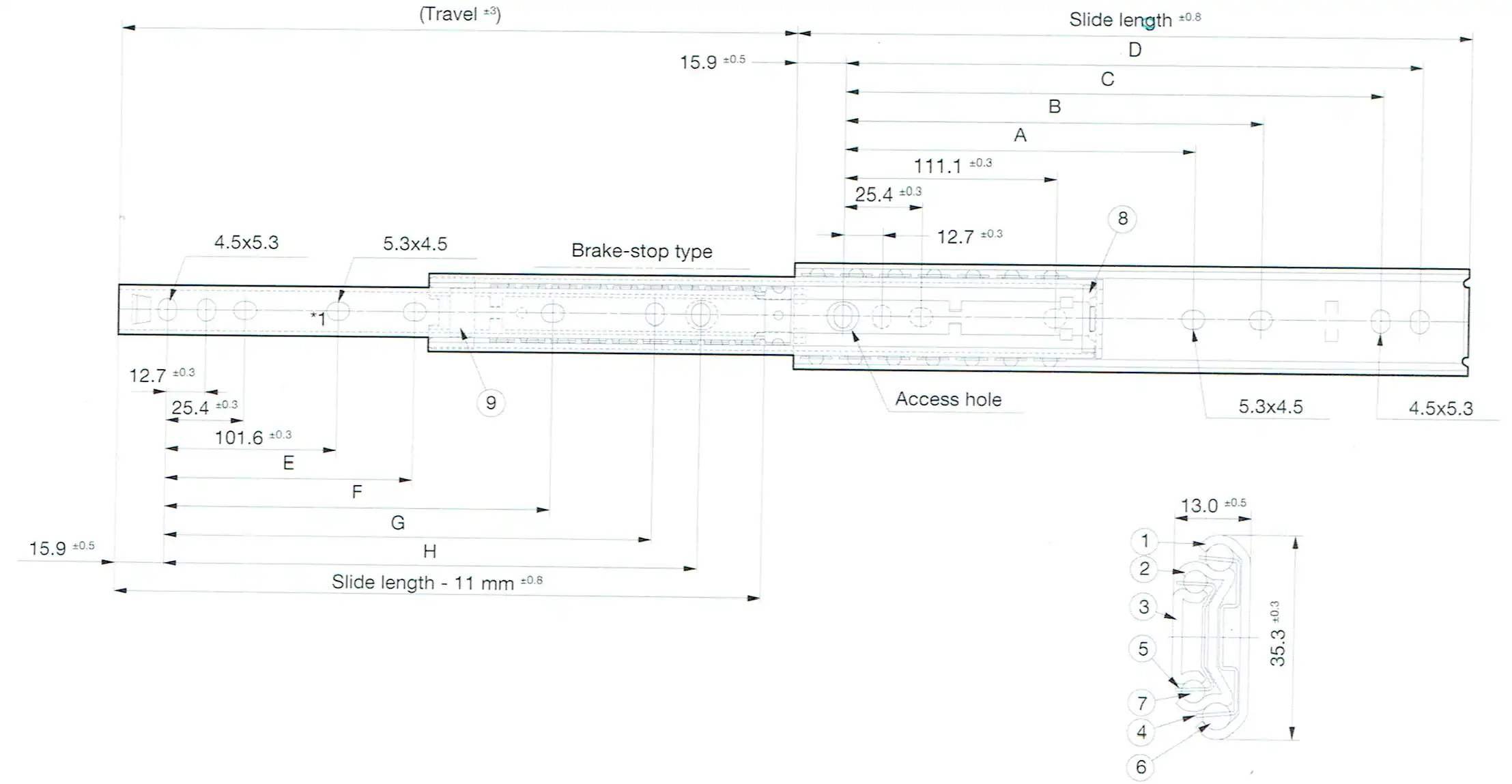 | Part Number | Slide Length (mm) | Travel (mm) | Mounting Hole (mm) ± 0.3 mm | Load Capacity (N/pair) | Product Weight (kg/piece) | Quantity in Package (pieces) | |||||||