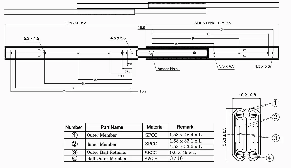 | Part Number | Slide Length (mm) | Travel (mm) | Mounting Hole (mm) ± 0.3 mm | Load Capacity (N/pair) | Product Weight (kg/piece) | Quantity in Package (pieces) | |||