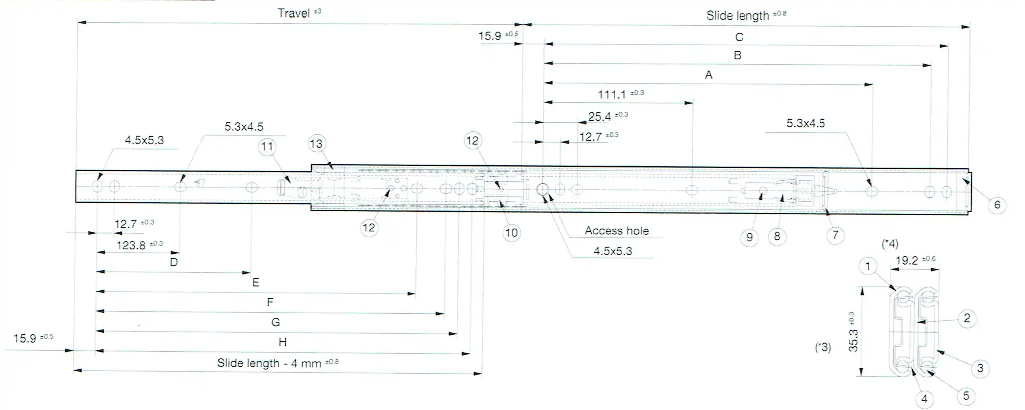 | Part Number | Slide Length (mm) | Travel (mm) | Mounting Hole (mm) ± 0.3 mm | Load Capacity (N/pair) | Product Weight (kg/piece) | Quantity in Package (pieces) | |||||||