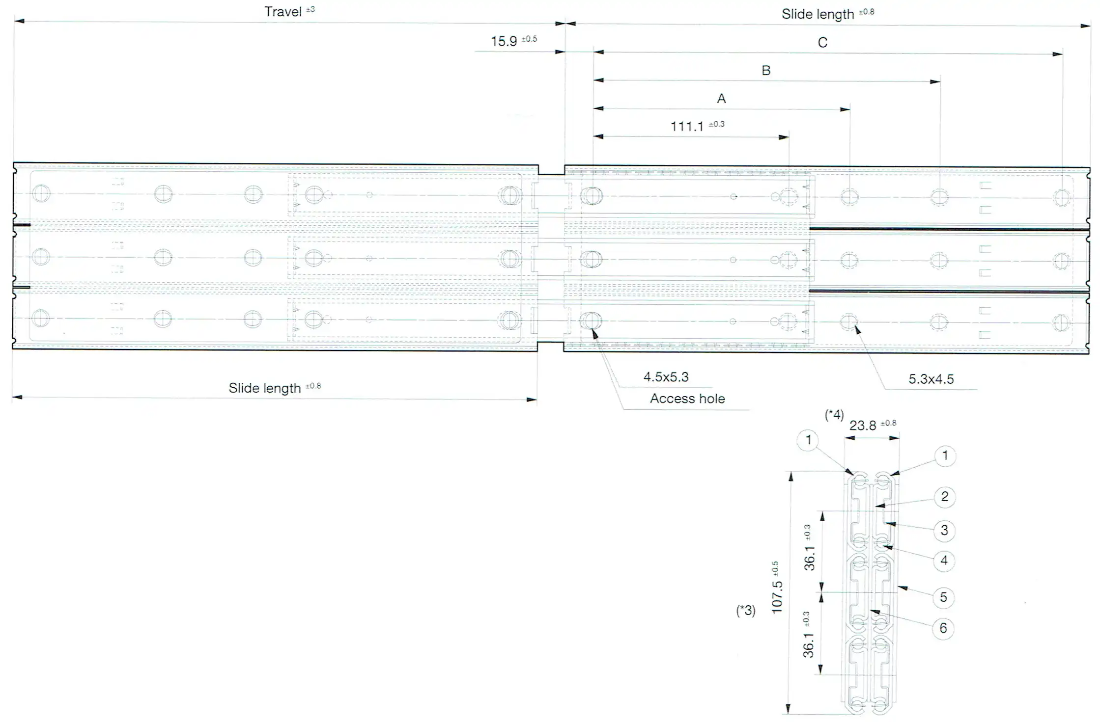 | Part Number | Slide Length (mm) | Travel (mm) | Mounting Hole (mm) ± 0.3 mm | Load Capacity (N/pair) | Product Weight (kg/piece) | Quantity in Package (pieces) | ||