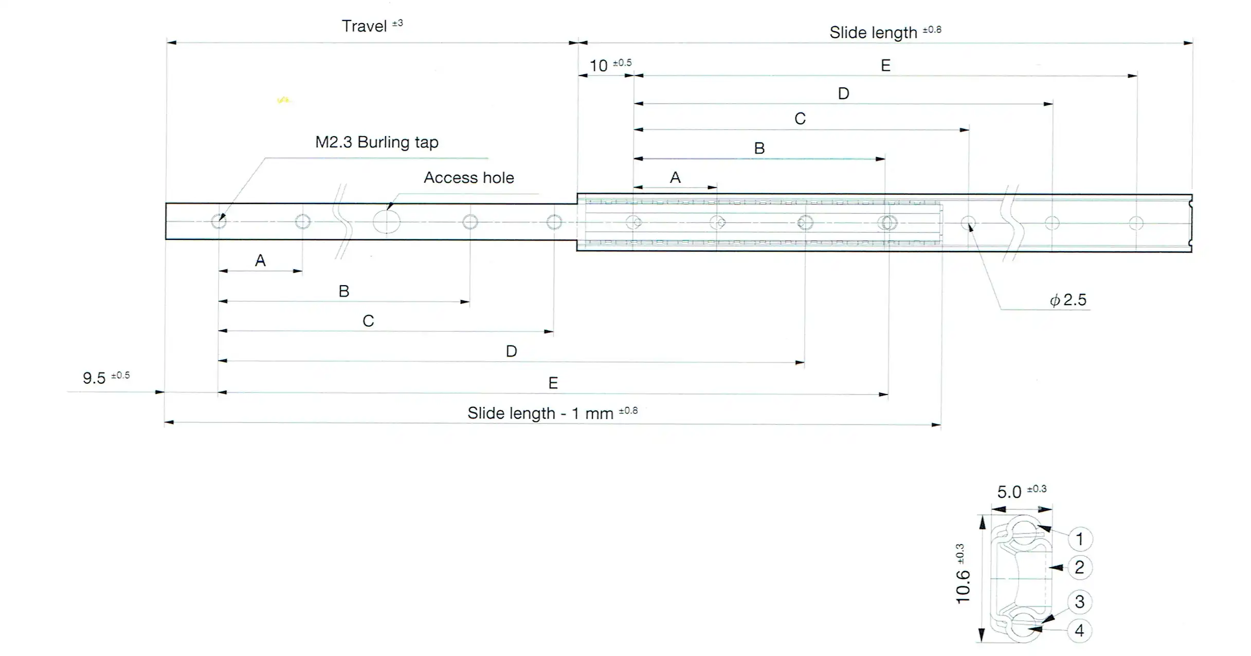 | Part Number | Slide Length (mm) | Travel (mm) | Mounting Hole (mm) ± 0.3 mm | Load Capacity (N/pair) | Product Weight (kg/piece) | Quantity in Package (pieces) | ||||
