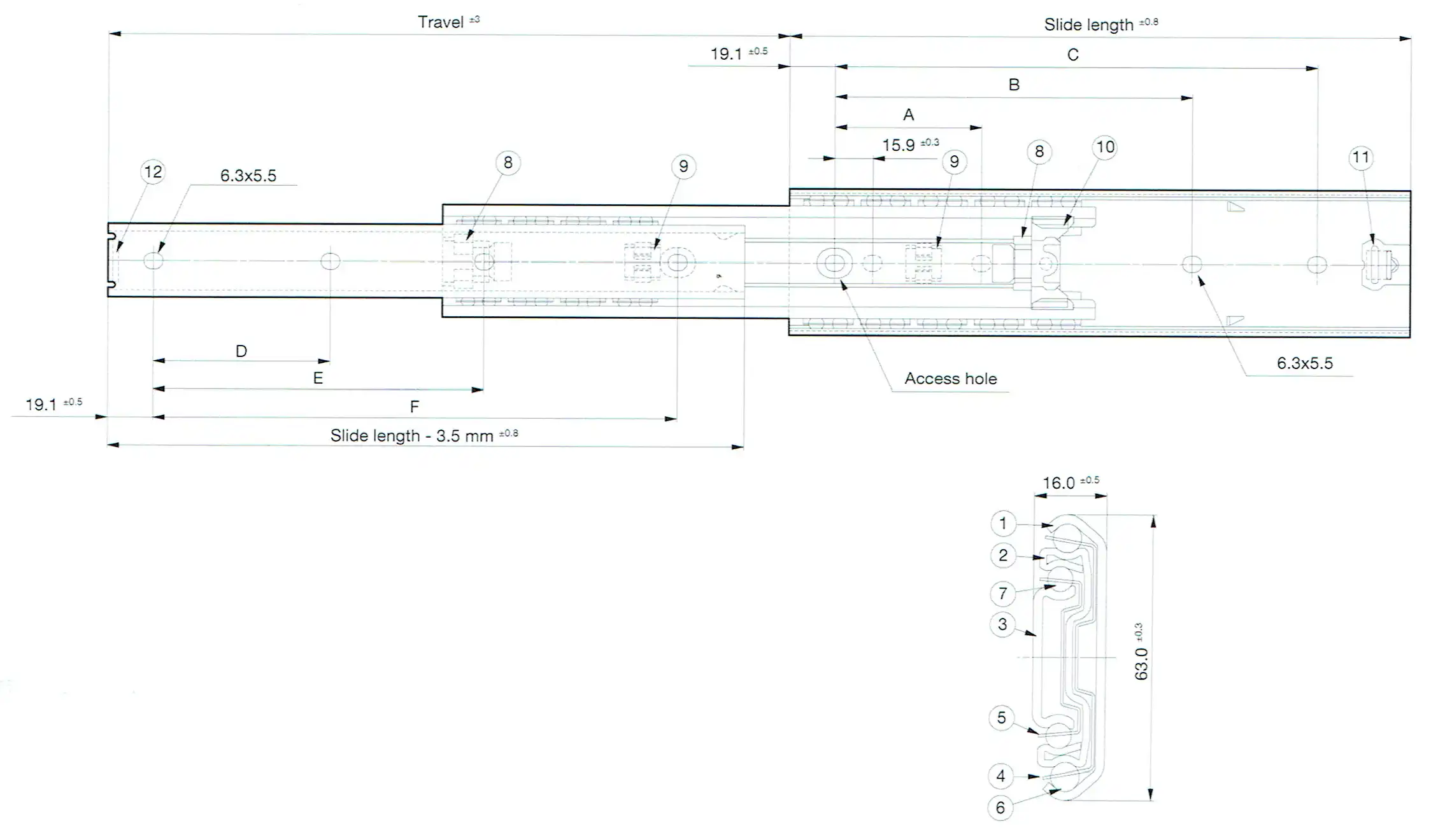 | Part Number | Slide Length (mm) | Travel (mm) | Mounting Hole (mm) ± 0.3 mm | Load Capacity (N/pair) | Product Weight (kg/piece) | Quantity in Package (pieces) | |||||