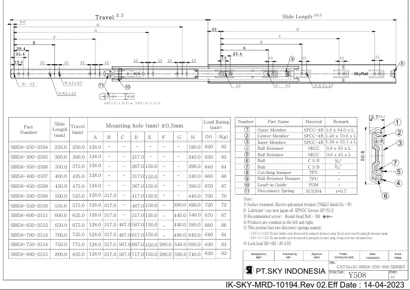 | Part Number | Slide Length (mm) | Outer Length (mm) | Inner Length (mm) | Braket Length (mm) | Center Travel (mm) | Travel (mm) | Mounting Hole (mm) ± 0.8 | Load Rating (pair) | ||||||||