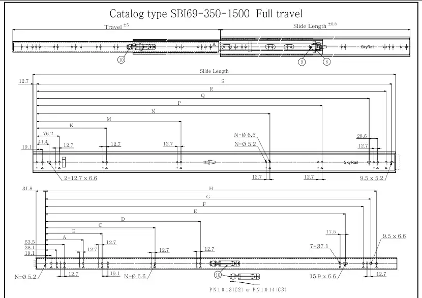 | Part Number | Slide Length (mm) | Outer Length (mm) | Inner Length (mm) | Braket Length (mm) | Center Travel (mm) | Travel (mm) | Mounting Hole (mm) ± 0.8 | Load Rating (pair) | |||||||||||||||