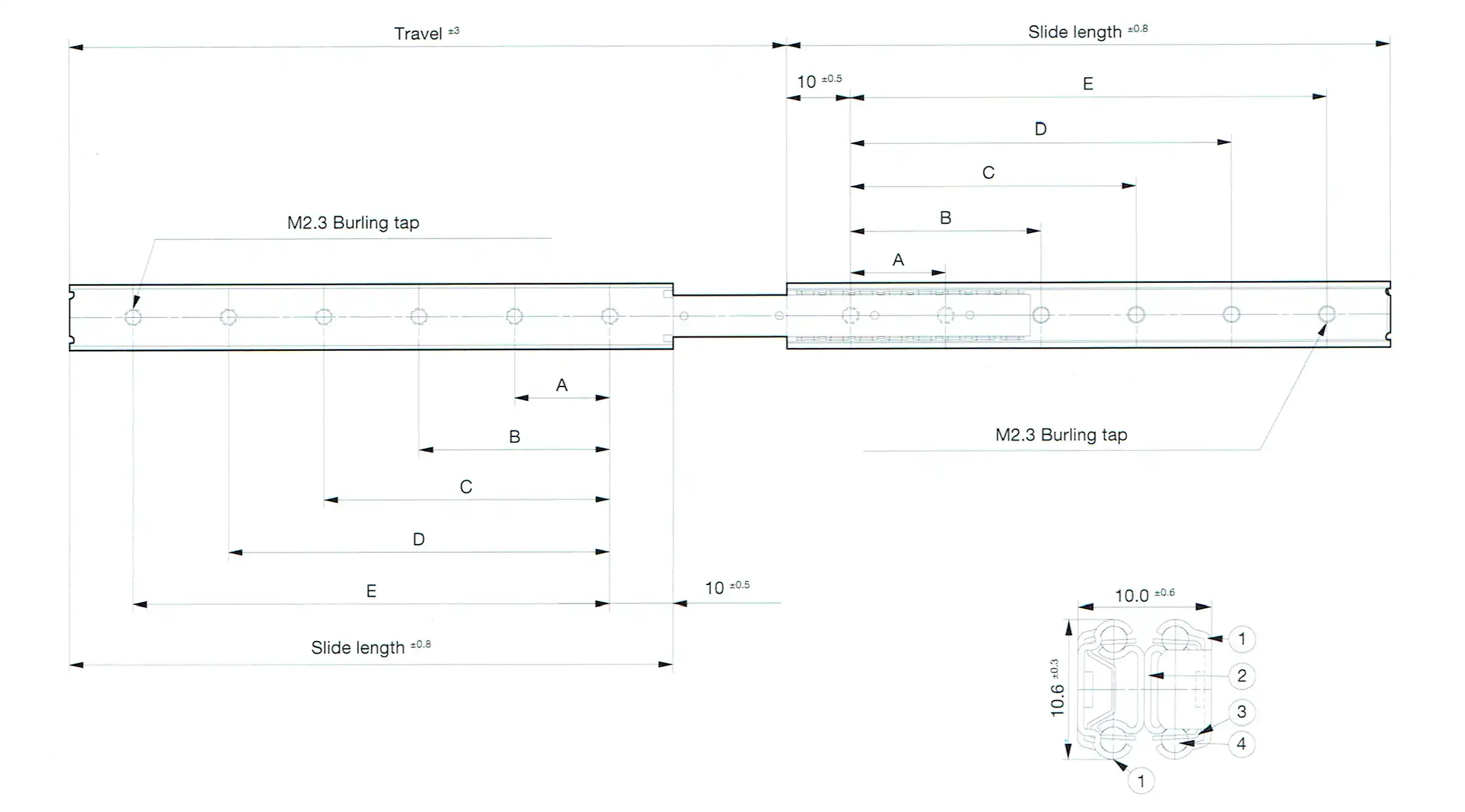| Part Number | Slide Length (mm) | Travel (mm) | Mounting Hole (mm) ± 0.3 mm | Load Capacity (N/pair) | Product Weight (kg/piece) | Quantity in Package (pieces) | ||||