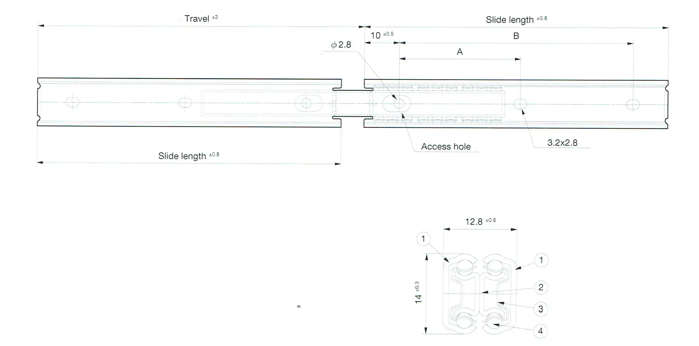 | Part Number | Slide Length (mm) | Travel (mm) | Mounting Hole (mm) ± 0.3 mm | Load Capacity (N/pair) | Product Weight (kg/piece) | Quantity in Package (pieces) | |
